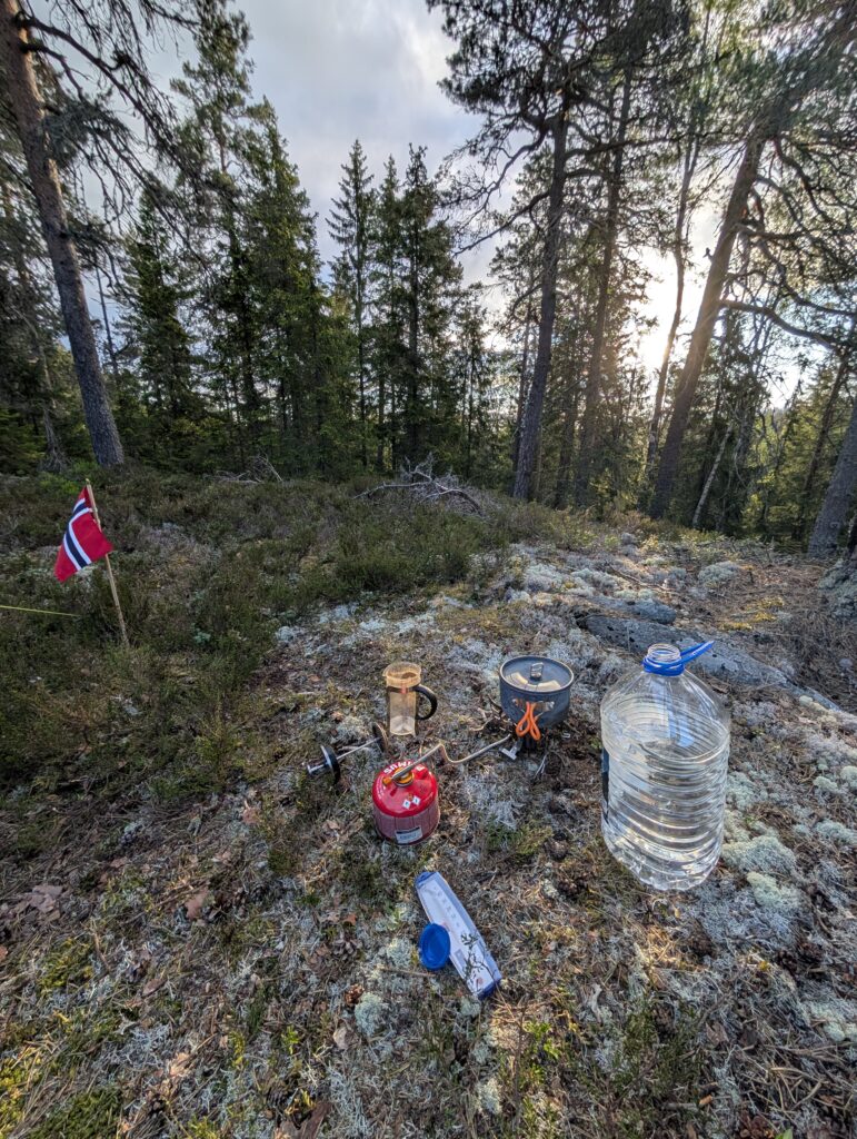 At trips like these; food and water dominates most of the carried weight. I had allready precooked the dinners for four meals and dividing the rations in separate bags. In addition to precooked dinners I brought wholewheat biscuits, cheese and a lot of snacks and candies! (It was going to be a national day celebration after all 🙂